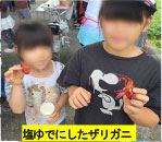 藻川の魚,カニ,エビ,ザリガニ,ウシガエル,バッタ,キクイモなどをから揚げや塩ゆでにして味わいました。キッズクラブの高校生が4人、スタッフをしてくれました。