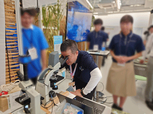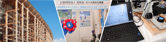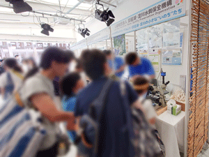 私たちのブースでは、前日に琵琶湖南部および淀川下流の水を採取し、その水を顕微鏡で見てもらい、現在の琵琶湖・淀川流域の水質に関心をもってもらうというものです。